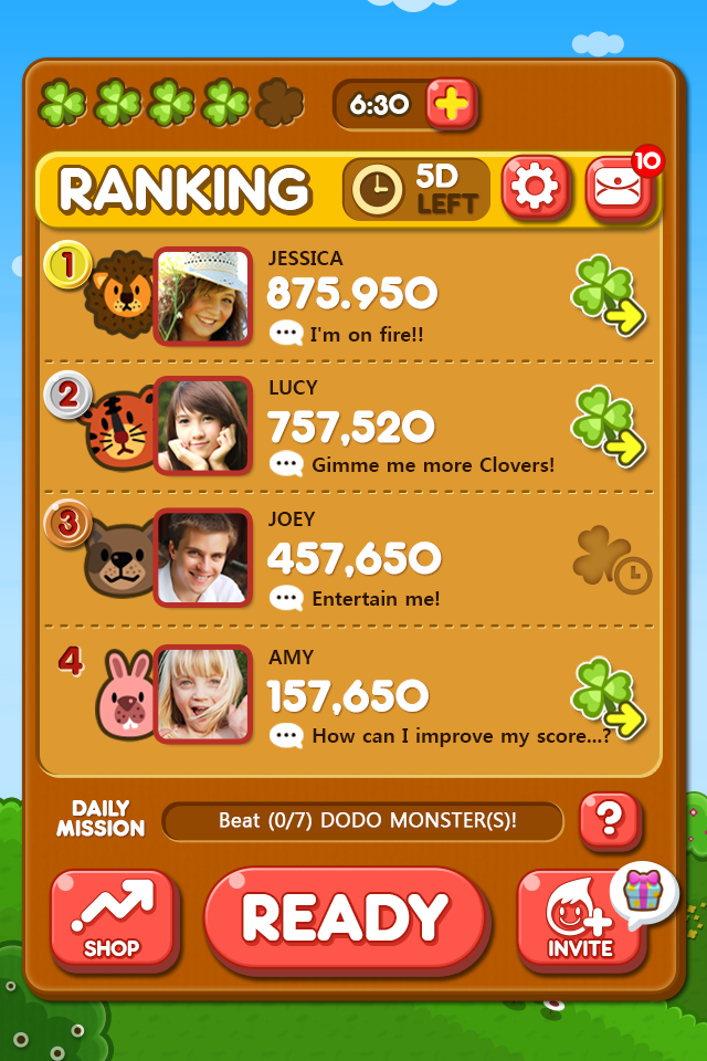 Login with LINE to make it even more fun! Compete with your friends in the ranking and send Clovers (one Clover is needed for each play) to one another.
