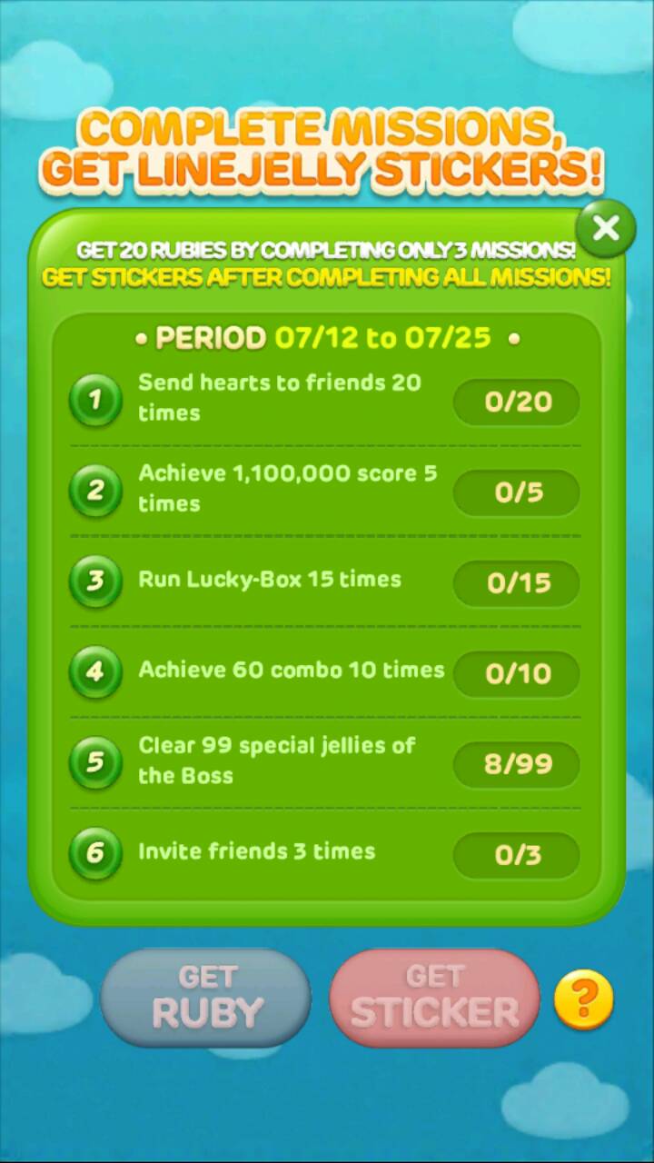 In the new Missions feature, you can get 20 Rubies just by completing 3 missions! Plus, if you complete all 6 of them, you’ll be entitled to download a set of limited edition stickers featuring Moon and the Boss!