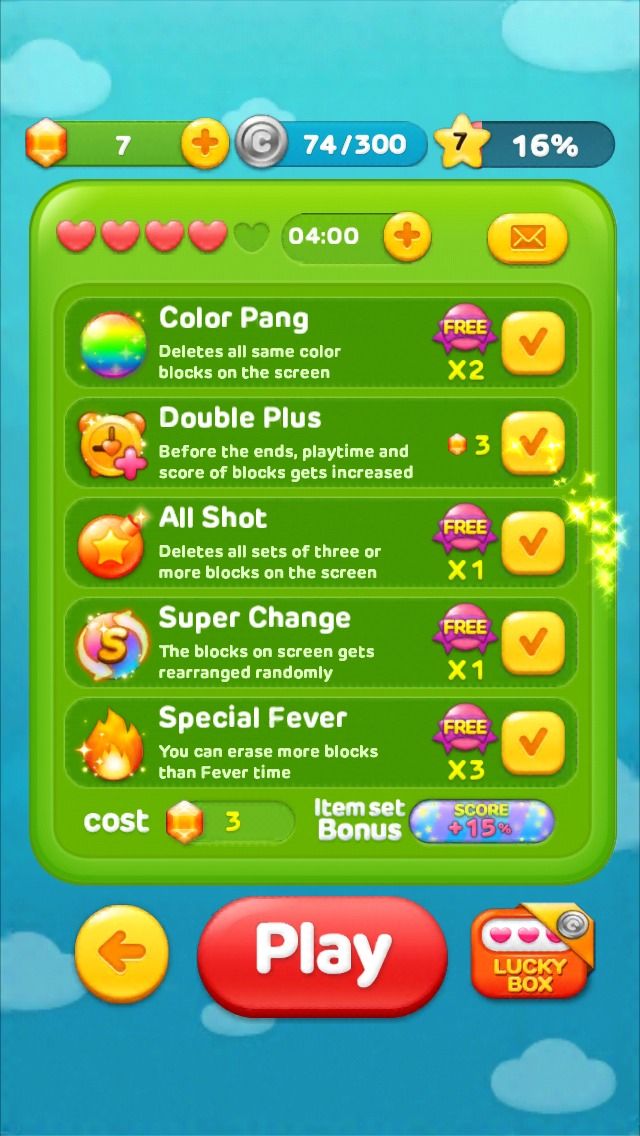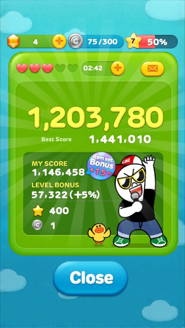 The new version of LINE JELLY features an Item set Bonus. Get score bonuses of up to 15% for using items! The more items you use, the higher the bonus rate will be!